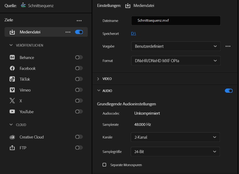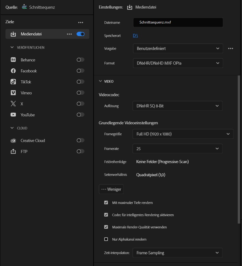 Videocodec: Avid DNxHD 120 1080p25 od. DNxHR SQ 1080p25, keine Halbbilder: progressiv