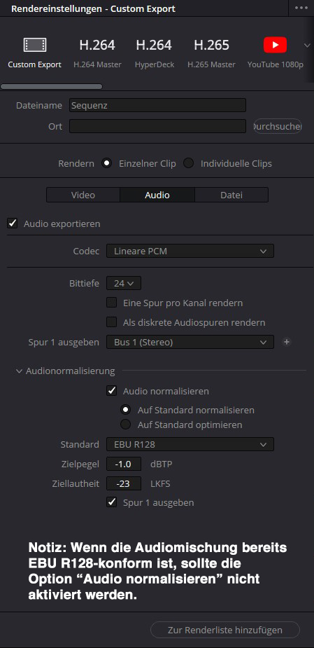 Pegel: EBU R128 (Programmlautheit: –23,0 LUFS, +/–0,5 LU Toleranz, Sputzenpegel: –1 dB TP)